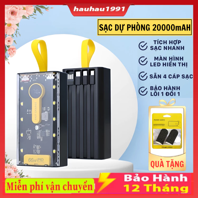 Sạc Dự Phòng Trong Suốt 20000mAh , Sạc Siêu Nhanh PD- 60W Bản 2 Cell Pin Dung Lượng Thực (BH 1Năm)